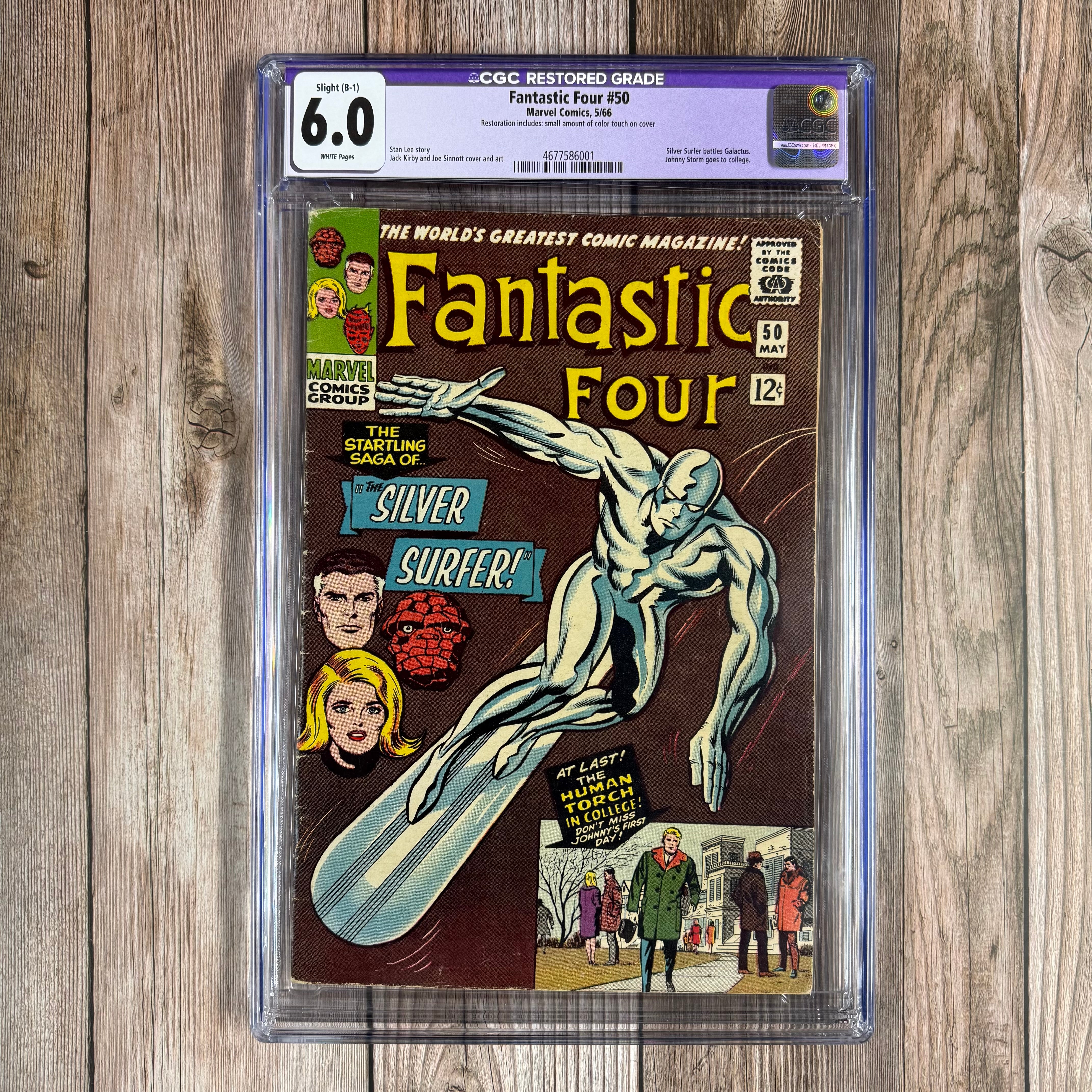 Fantastic Four #50 CGC 6.0 WP Slight (B-1) Restored Grade, ICONIC cover art by Jack Kirby, Classic battle of Silver Surfer vs Galactus, 1st appearance of Wyatt Wingfoot (cert:6001) *