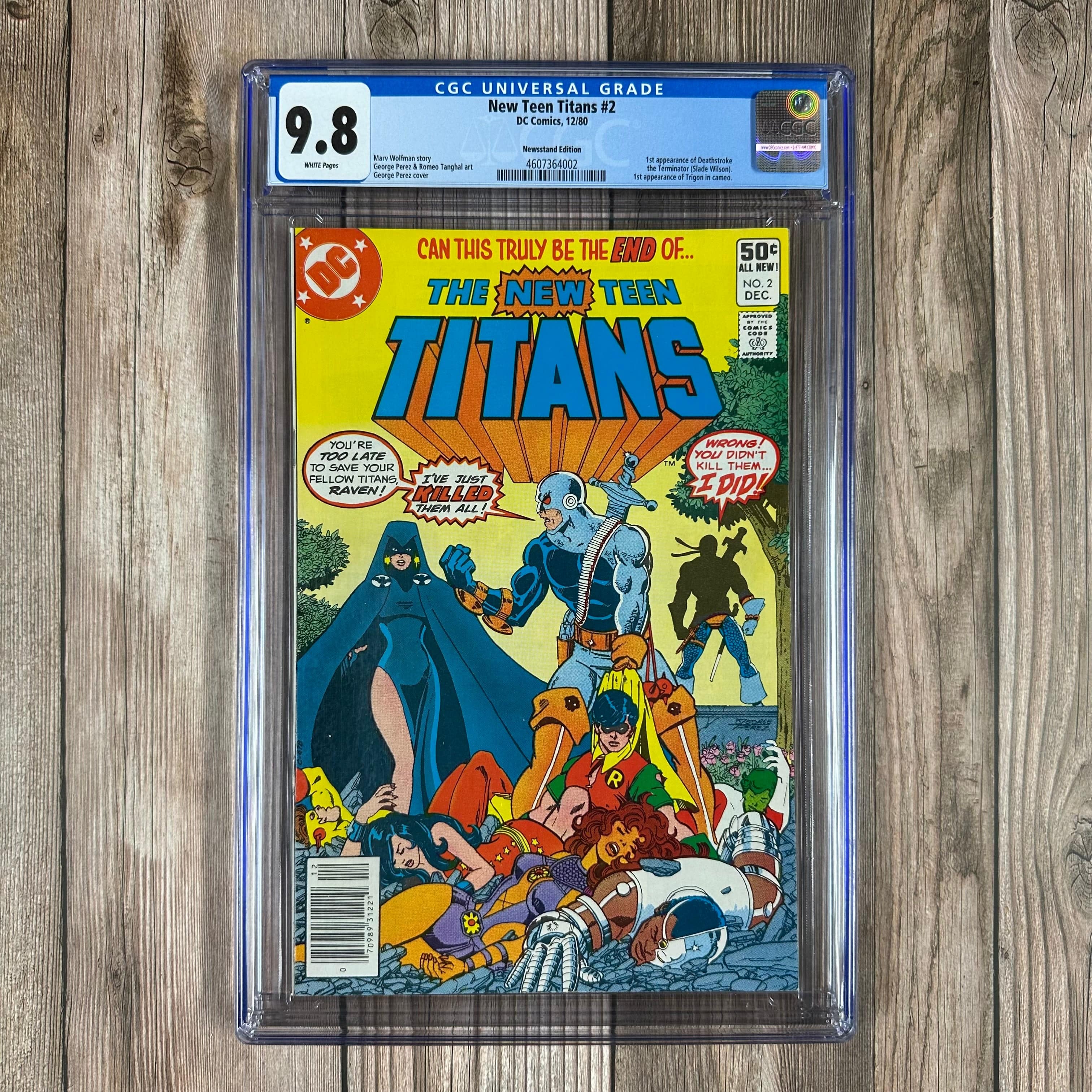 Grant takes his revenge on the titans. Does Raven save them in time?When the enigmatic heroine known as Raven assembled the New Teen Titans in issue #1 of their new series, it was in order to battle her demonic father, Trigon. However, on their way to that fight, the Titans met a villain who would play an even bigger role in their lives; the ruthless mercenary Slade Wilson, known as Deathstroke the Terminator.Debuting in the shadows of the cover to the team's 2nd issue, written by Marv Wolfman and meticulously illustrated by artist George Perez, Deathstroke was contacted by the criminal organisation known as the H.I.V.E. , and asked to kill the Teen Titans. Refusing to work without an advance, Deathstroke turned down the offer only to see his son Grant Wilson take up the contract using the moniker "the Ravager."Unfortunately, Grant died during the ensuing battle when the H.I.V.E. experiment to increase his brain power also caused him to age at an accelerated rate. Later, when Deathstroke arrived to collect his son's body, he naturally blamed the Titans for Ravager's death, unwittingly playing right into the H.I.V.E.'s scheme. Deathstroke swore revenge against the Titans and began to plot their deaths - the true goal of the H.I.V.E. all along.Deathstroke would soon become a recurrent thorn in the Titans' side, and he remains an ever present watchful eye on their activities to the present day. 1st appearance of Deathstroke