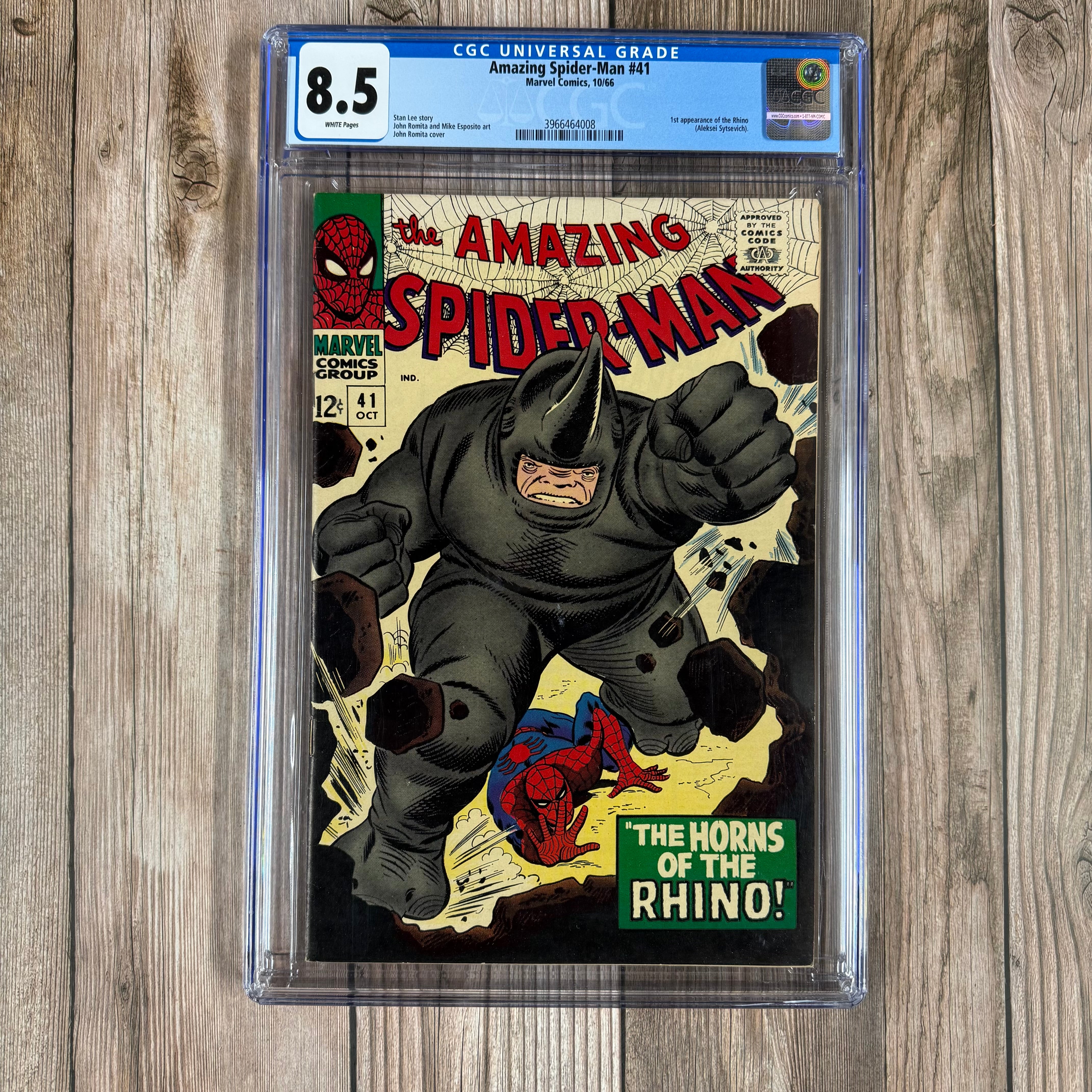 THE HORNS OF THE RHINO! Spider-Man (Peter Parker) is buying a new motorcycle and calls J. Jonah Jameson for a credit reference and he approves knowing he’ll get cheaper pictures. John Jameson is visiting and even though Jonah goes on a tangent about Spider-Man, John expresses his appreciation for Spider-Man since he saved him in the out of control space capsule. John tells his dad that he’s been cleared by NASA recently. After his last spacewalk, space spores attached to him and NASA believes they may help the USA in the space race. NASA has assigned him bodyguards to prevent kidnapping from competing countries. At that moment, a giant man in a rhinoceros costume is charging across the Mexican border with bullets ricocheting off, clobbering through anything in his way. Meanwhile, Pete runs into Betty Brant who has just returned to town. As they talk, they fumble for words and realize their feelings for each other are gone. Pete excuses himself and he sees footage of Rhino. When Rhino reaches New York, Spider-Man goes to find him. He arrives at John Jameson’s hotel suite to find John kidnapped by Rhino. Spider-Man confronts Rhino and learns he’s kidnapped John in order to sell him to the highest bidder and deliver secrets known to him about his space missions. Spider-Man begins to fight him but realizes he can’t fight Rhino head-on as he keeps charging and could easily destroy him. Spider-Man trips and flips Rhino onto his head knocking him unconscious for the police to arrest him. The next day, Pete is going to school on his bike, Gwen Stacy notices his new ride and mentions it. As he tells her she’s got a lot to learn about him, they both really notice each other for the first time. Pete comes home and is reminded that he’ll be meeting Anna Watson’s niece, Mary Jane soon and to not miss dinner with the Watsons.