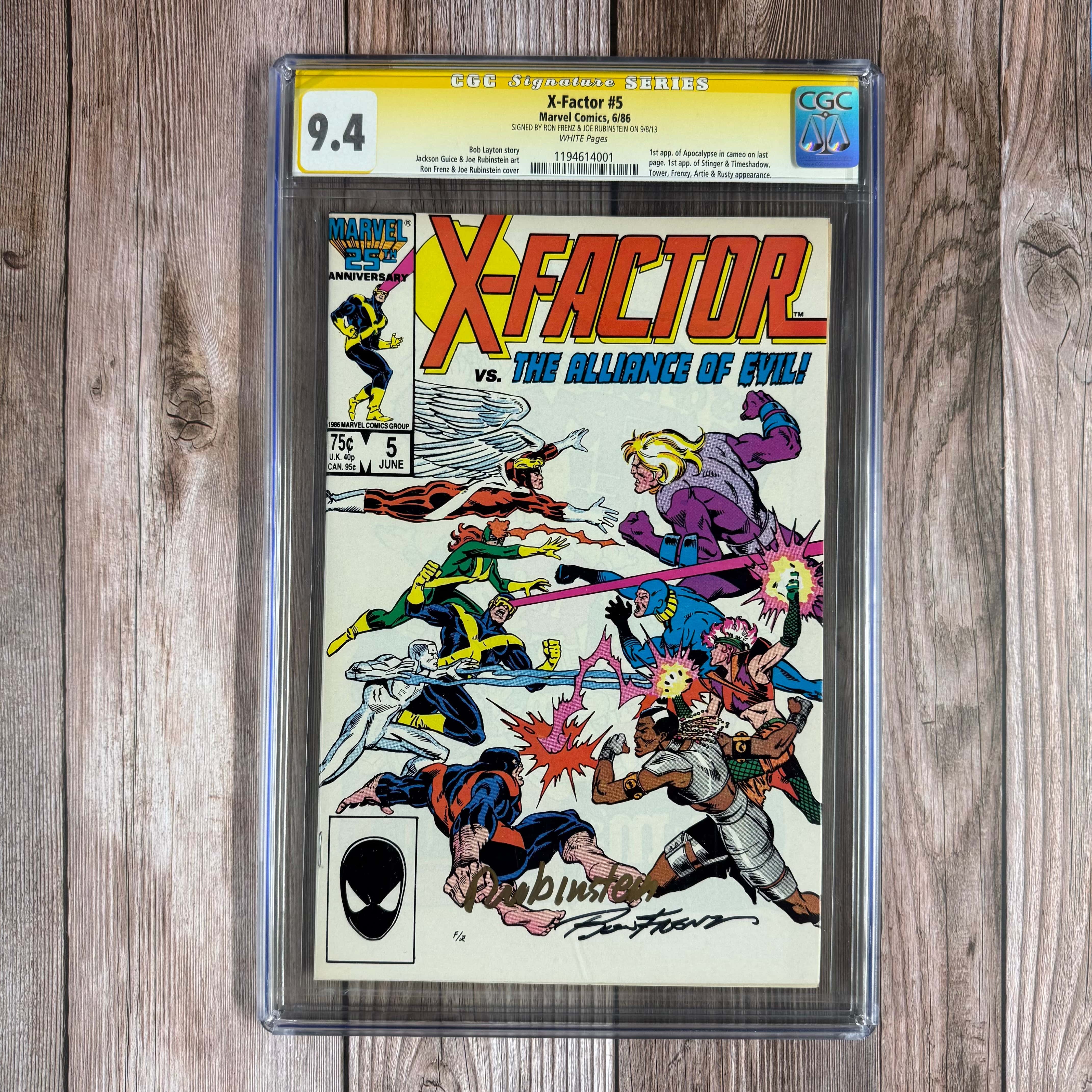 X-Factor #5 CGC 9.4 WP SS Signed by Ron Frenz & Joe Rubinstein, 1st cameo appearance of Apocalypse, 1st appearance of Stinger and Timeshadow, 1st team appearance of Alliance of Evil (cert:4001)