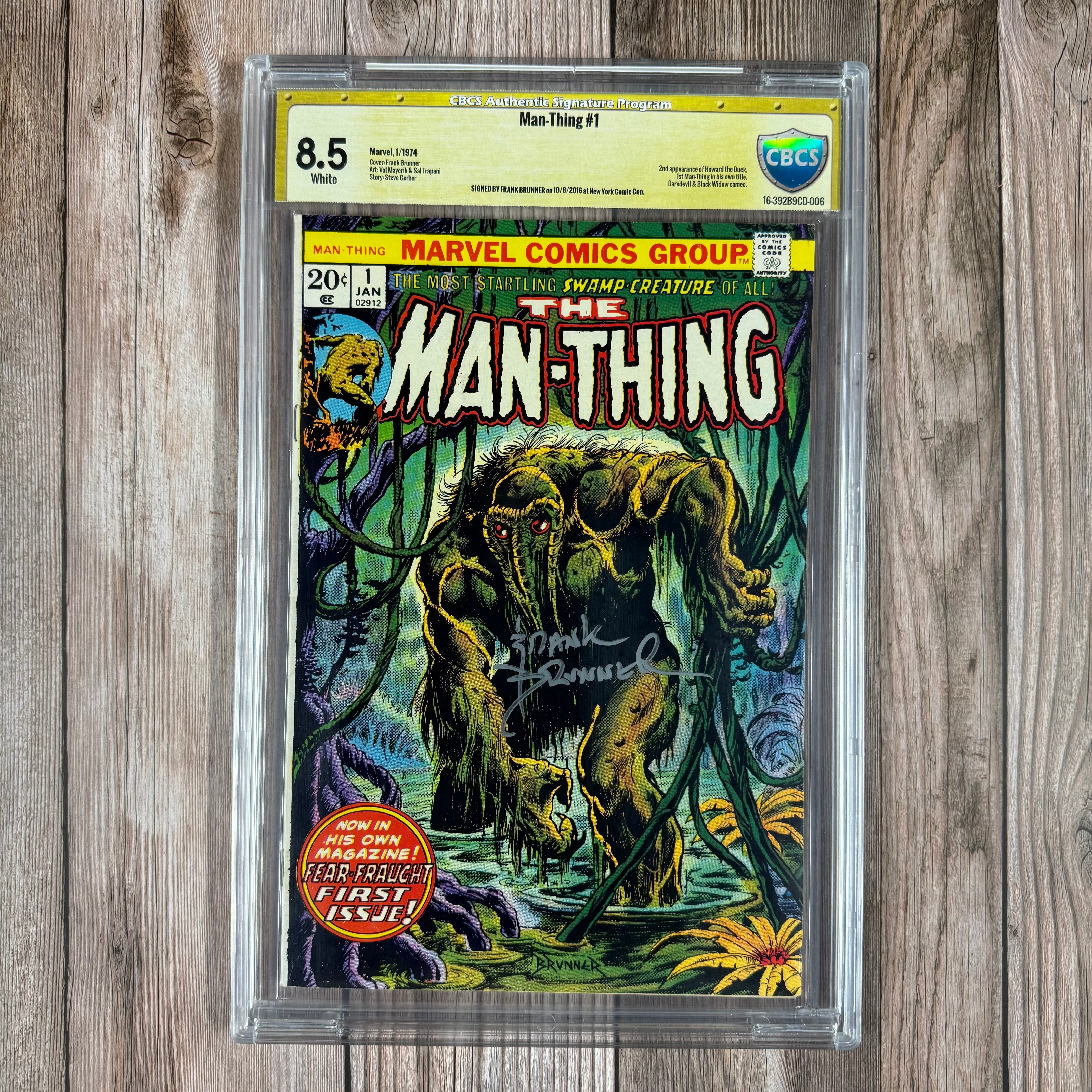 Man-Thing #1 CBCS 8.5 WP Witnessed Signature of Frank Brunner 1st Man-Thing solo title, 2nd appearance of Howard the Duck
