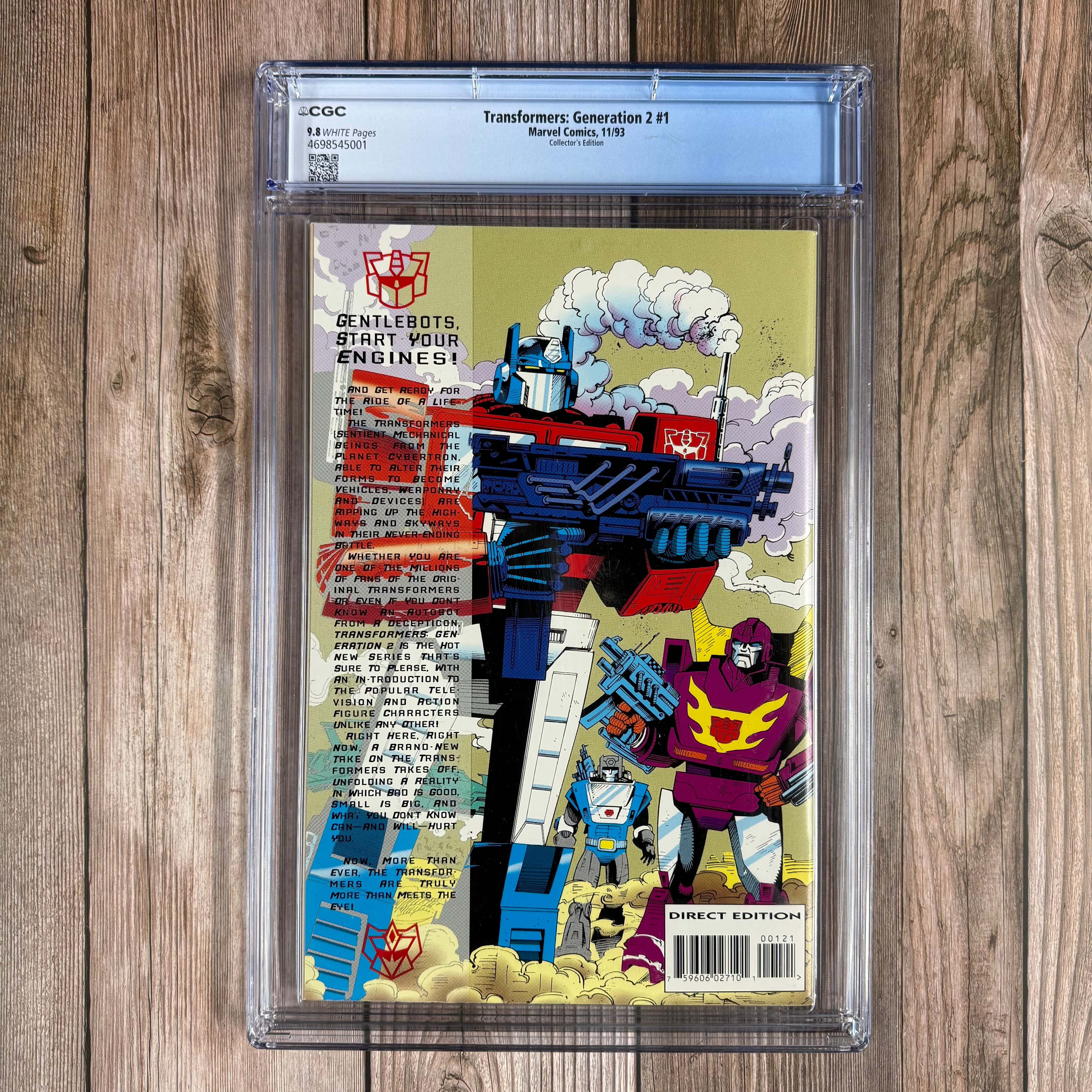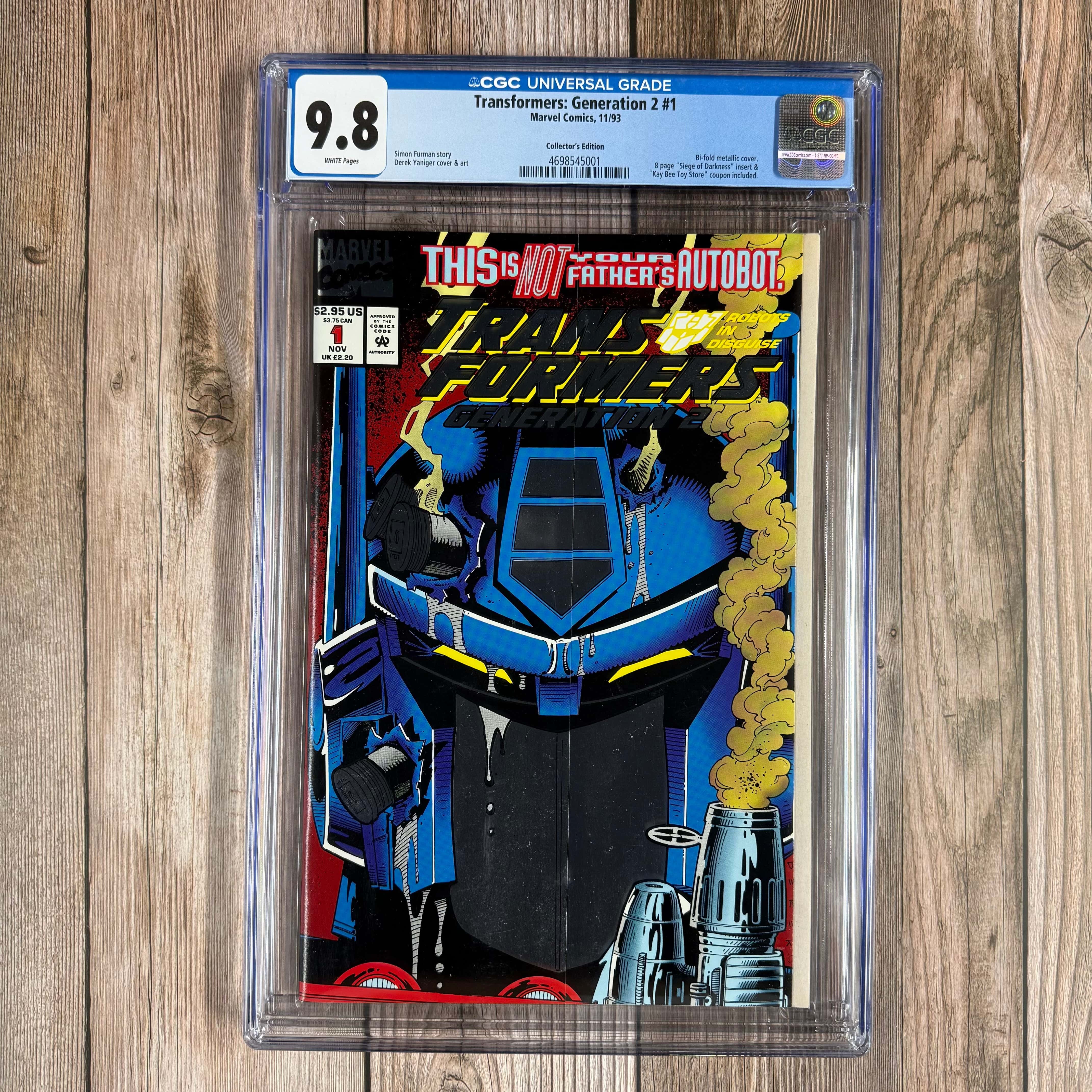 Transformers: Generation 2 #1 CGC 9.8 WP Collector's Foil Edition, Bi‘fold metallic cover, 8 page "Siege of Darkness" insert & "Kay Bee Toy Store" coupon included.