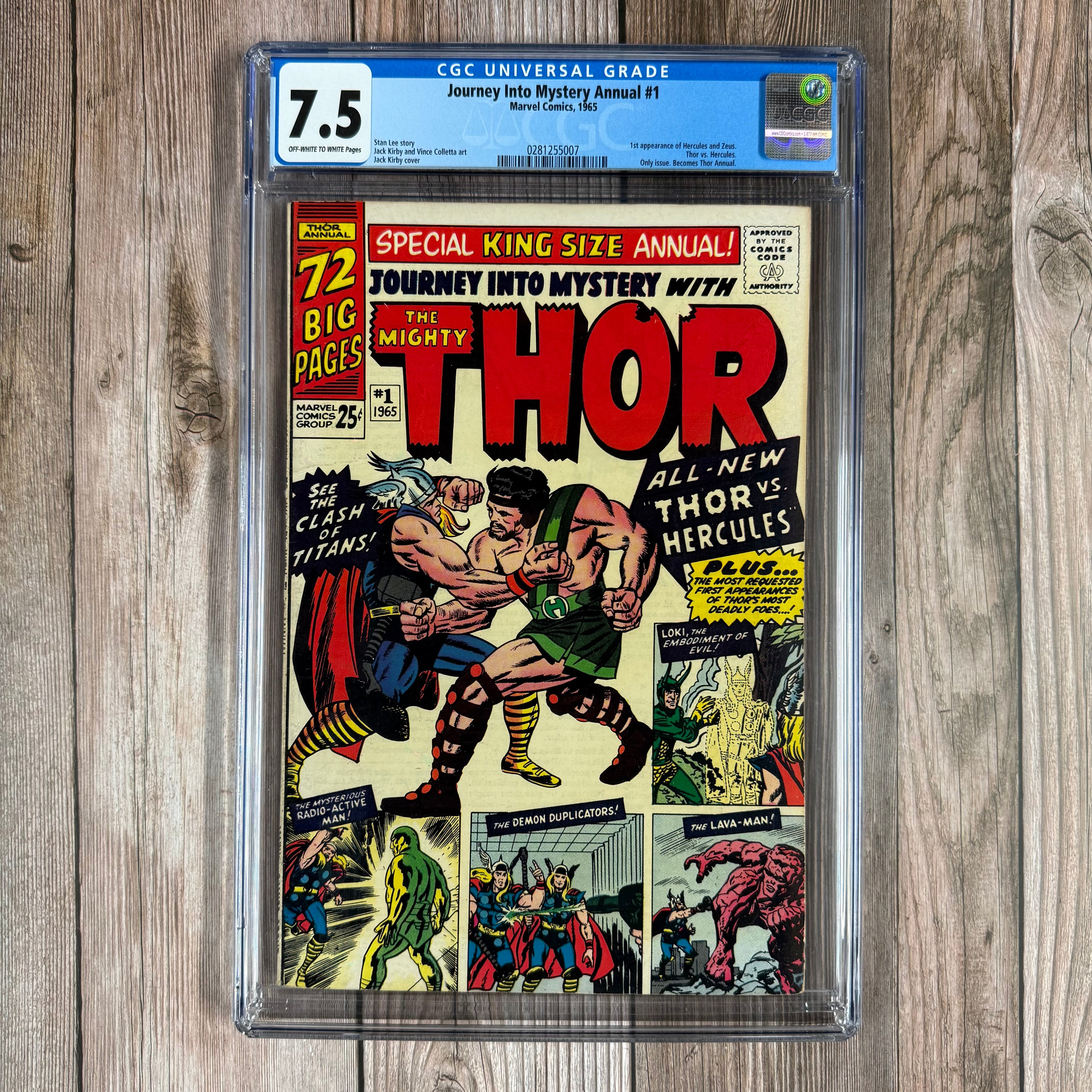 "When Titans Clash!" Thor vs. Hercules! - (Lee / Kirby) While in Jotunheim, Thor discovers two storm giants trying to open the portal to Olympus. He succeeds in stopping them, but is himself transported to Olympus where he soon finds himself in conflict with the one and only Hercules! A Thor Bonus Feature - a map of Asgard by Jack Kirby "Trapped by Loki, the God of Mischief!" - reprinting the story of the same name from Journey into Mystery #85. Part 2 Thor the Mighty, "The Vengeance of Loki!" - reprints the second part of the Thor story from Journey into Mystery #85. "The Mysterious Radioative Man!" - (Lee / Berns / Kirby) reprinting the story of the same name from Journey into Mystery #93. The Mighty Thor Faces the Menace of... "The Demon Duplicators!" - (Lee / Berns / Sinnott) reprinting the story of the same name from Journey into Mystery #95. The Mighty Thor Battles... The Lava Man - (Lee / Kirby / Heck) reprinting the story of the same name from Journey into Mystery #97.