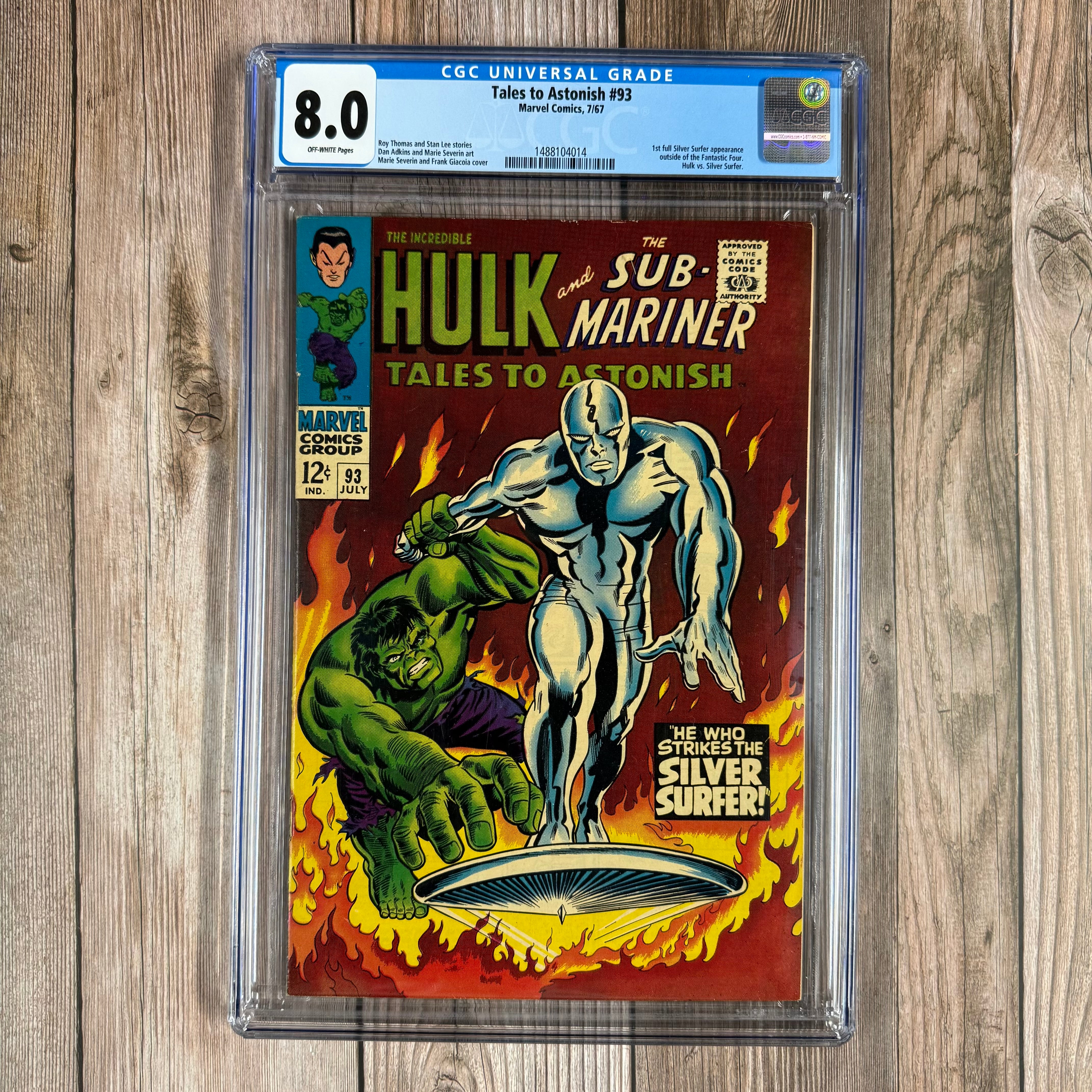 Tales to Astonish #93 CGC 8.0 Hulk vs Silver Surfer battle, ICONIC cover art by Marie Severin